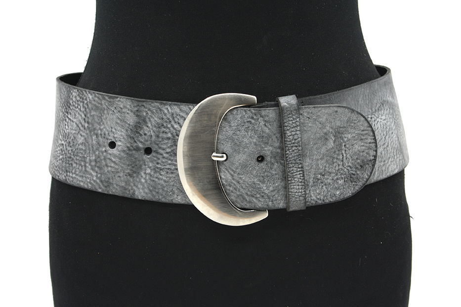 De zilverkleurige, nikkelvrije gesp heeft een verfijnde halfronde vorm, geïnspireerd op de maan, wat de riem een unieke en chique uitstraling geeft.