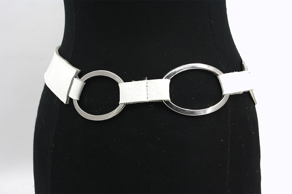 Deze riem bestaat uit twee delen, verbonden door drie ovale ringen, en is voorzien van stiknaden aan beide zijden voor een verfijnde afwerking.