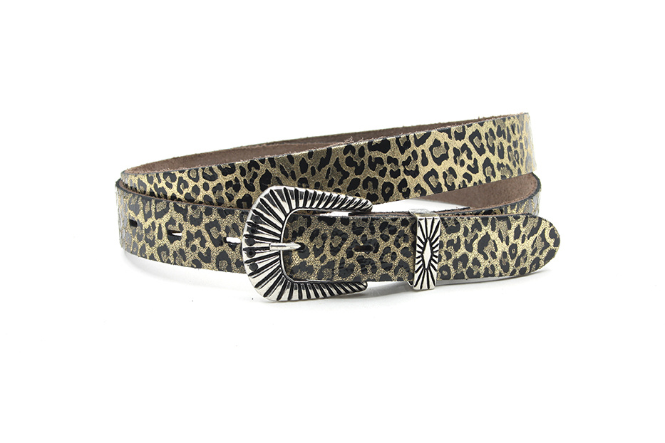 Elegant damesriempje van 2,5cm. breed in een stijlvolle goudlkleur met zwarte luipaardprint.