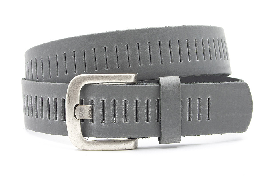 Donker grijze jeansriem met gleufjes. Deze gleufjes zitten over de hele lengte van de riem en daarom past deze stoere jeansriem altijd.