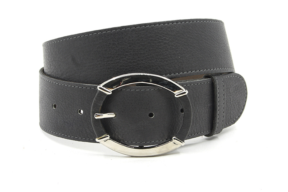 Zwarte damesriem van soepel soft leder, 5cm. breed en rondgesneden zodat 'ie mooi op de heupen valt.